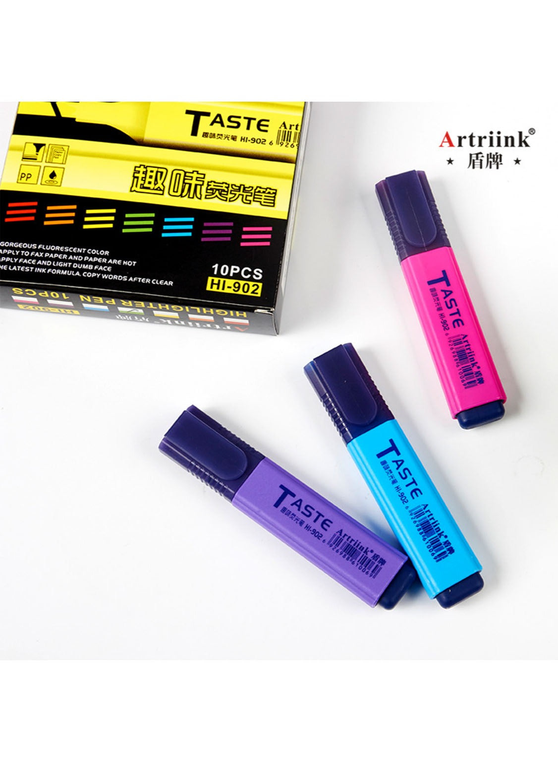• Pack of 10 highlighters with assorted fluorescent colors.